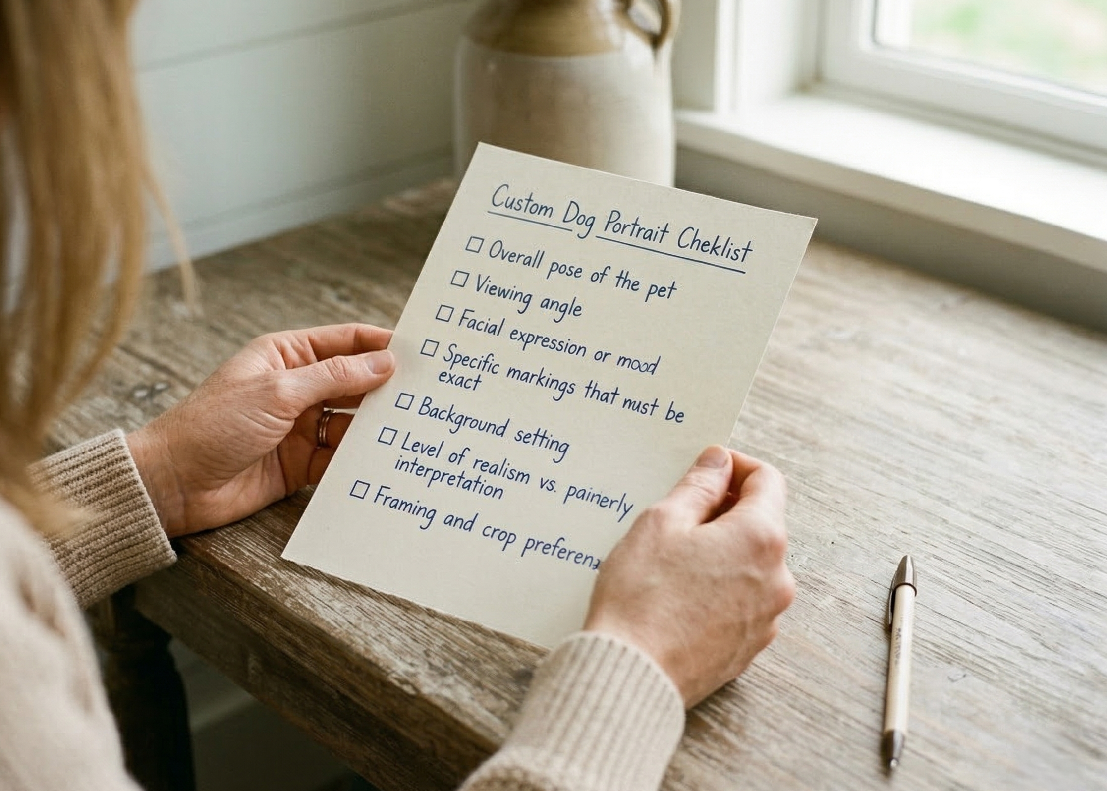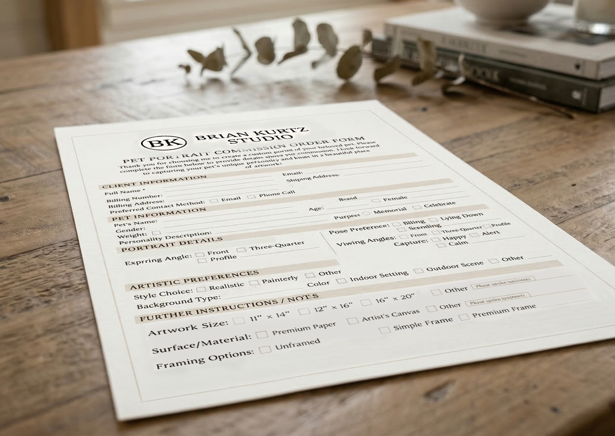 It may seem obvious, but everything begins with you filling out the order form with your name, your pet's name, the size and shape of the piece you want created, and any "setup" requests for the setting or pose of your pet.